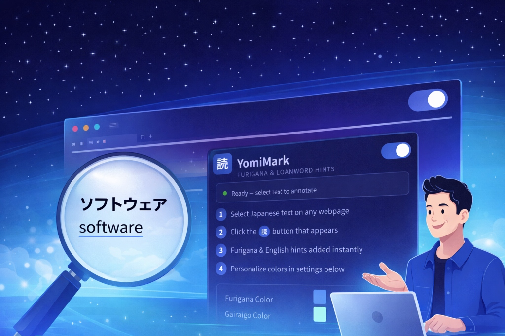 YomiMark is a browser extension that makes reading Japanese on the web seamless. It adds furigana to kanji, supports Gairaigo to English etymological mapping, and empowers you to read faster and learn more effectively.