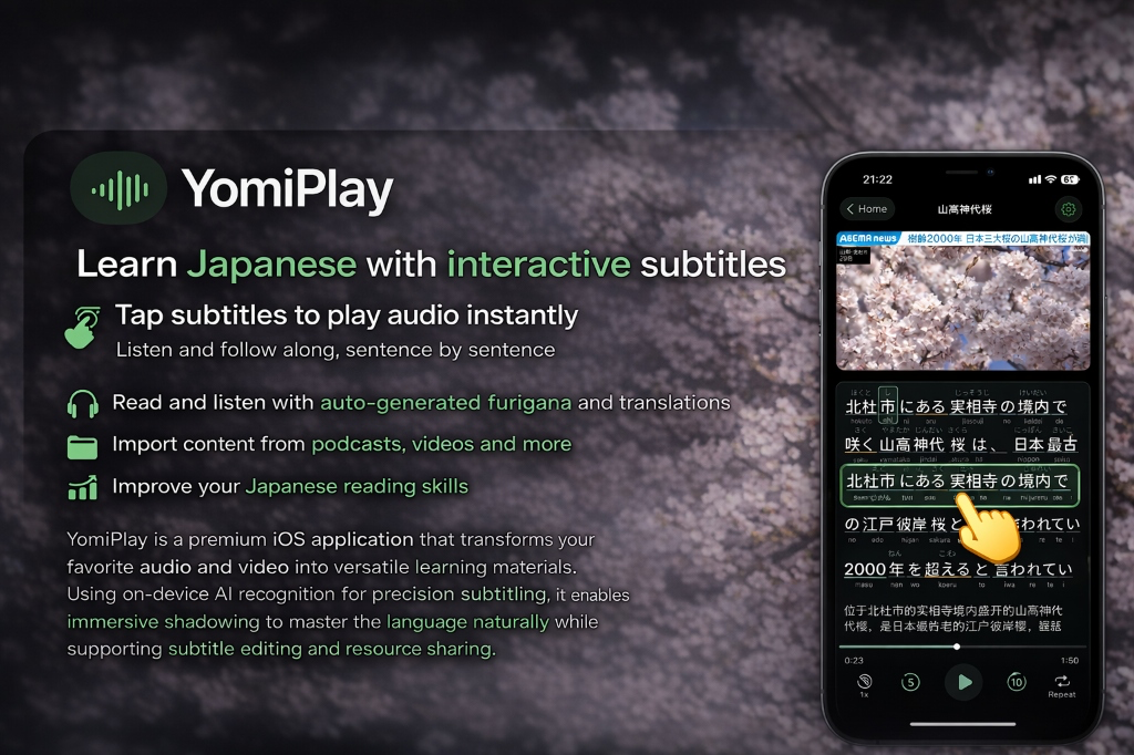 YomiPlay is a premium iOS application that transforms your favorite audio and video into versatile learning materials. Using on-device AI recognition for precision subtitling, it enables immersive shadowing to master the language naturally while supporting subtitle editing and resource sharing.